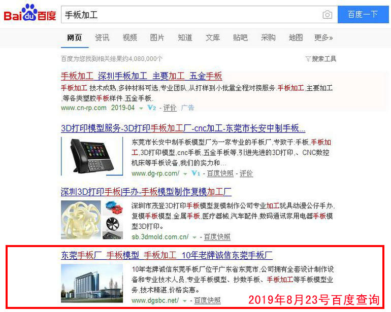 東莞手板廠 : 2019-02-28上線    2019-03-05百度第18名    2019-03-19百度第8名    2019-03-25百度第2名(排名第1名的網站www.dgsbc.net也是我公司管理優化的網站)